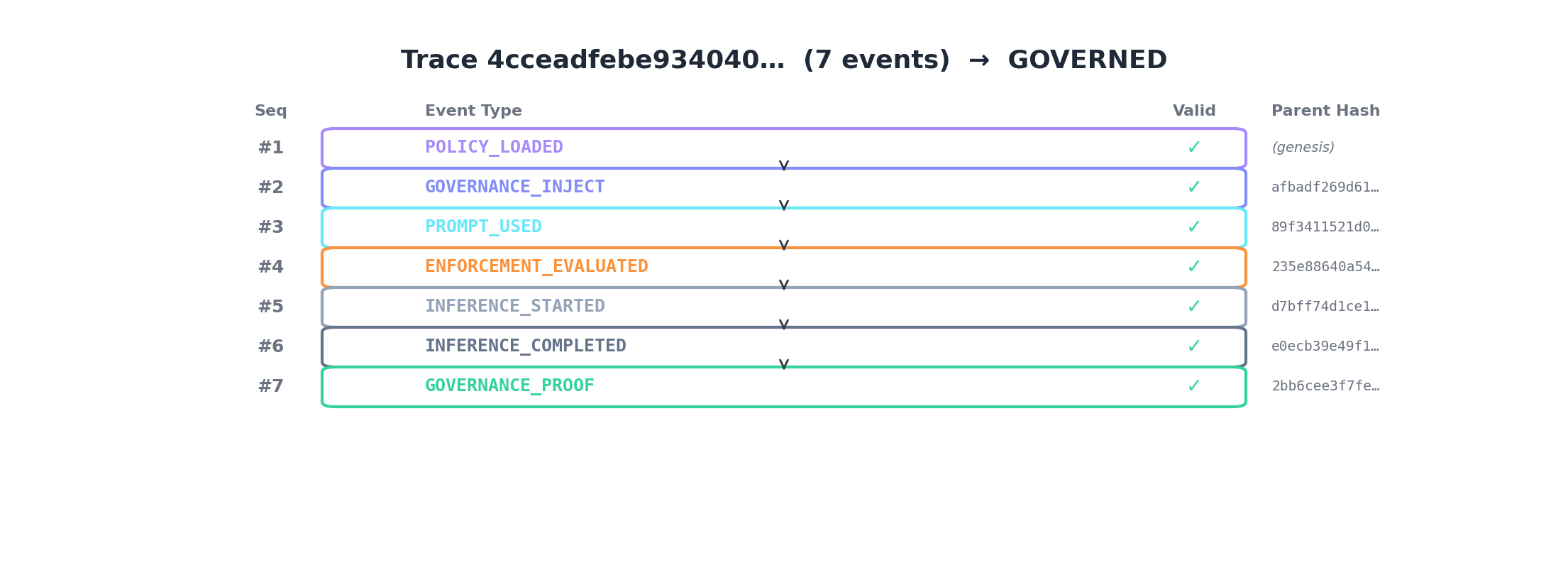 These results come from deterministic event simulation, not customer production workloads. While the event driver generates realistic governance flows with real SHA-256 hashes and JWS ES256 signatures, it does not exercise the full production data pipeline. Serialization round-trip issues could break hash chains in production.
